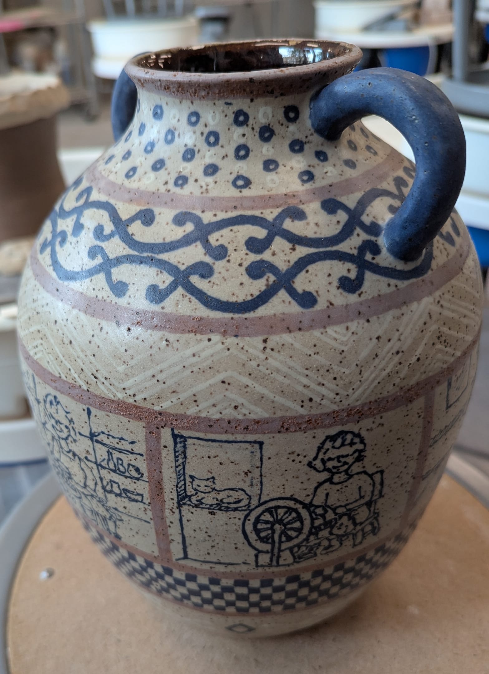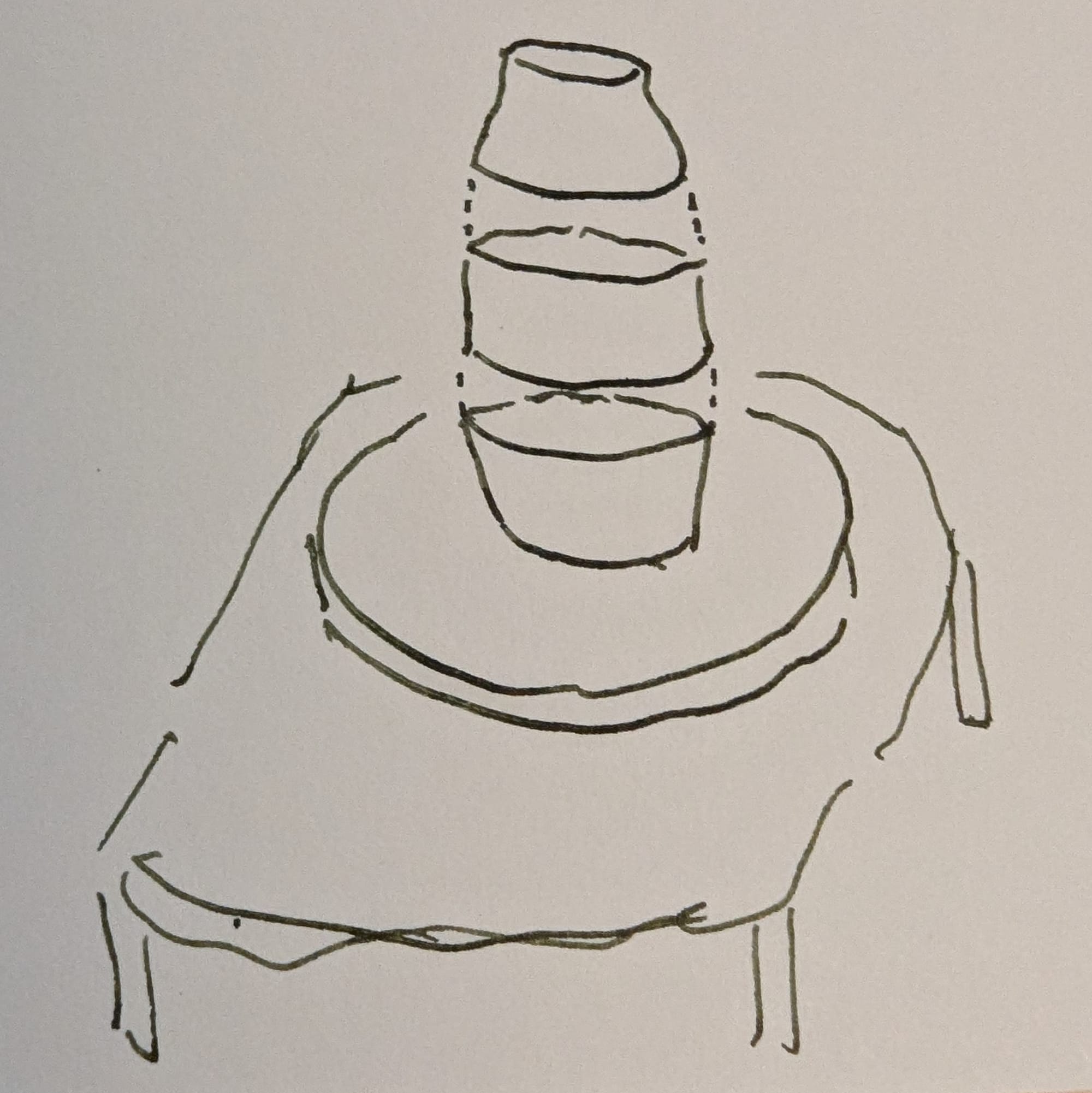 I have made some big amphora-ish pots (12" tall or a little bigger). For context, when I started taking pottery, my original aim was to make huge (two- or three- or four-foot) planters to use in my garden outside. This year, I took a series of "Big Pots" classes, and I made these three-part pots. They are constructed sort of like this: