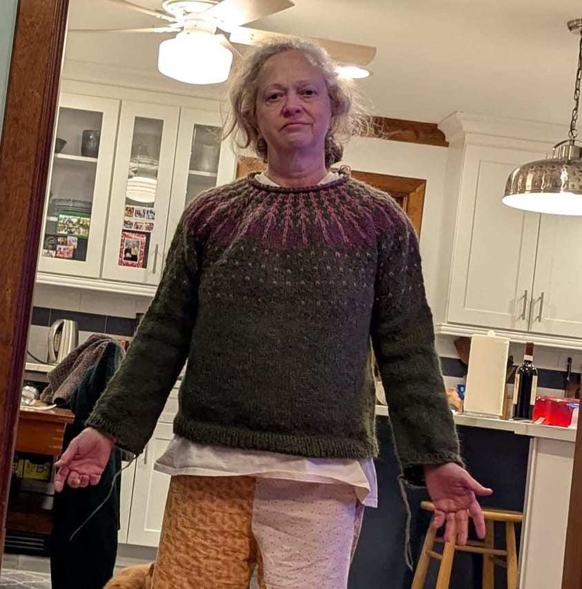 - I also got within a hair's breadth of finishing this sweater. I cast off the second sleeve at 12:05am on 1/1/26: