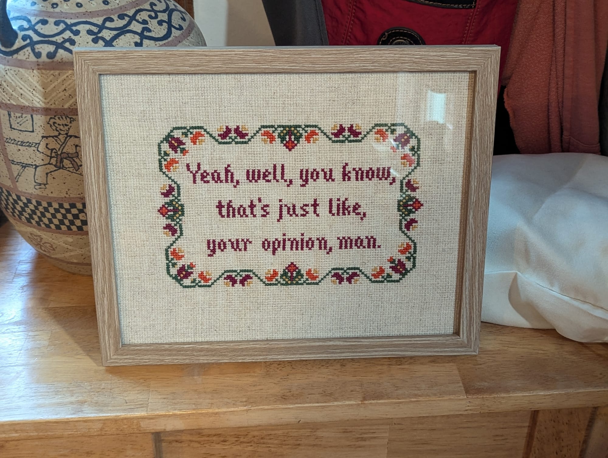 - Cross-stitched "Just your opinion, man"